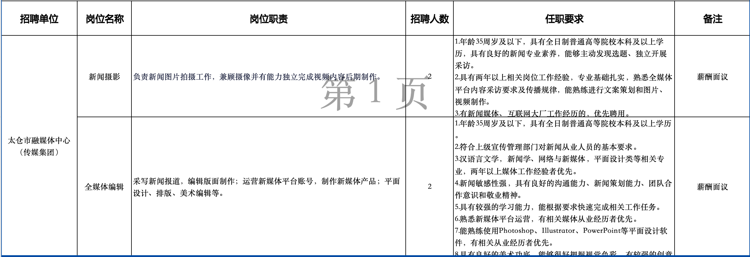新闻摄影2名、全媒体编辑2名(详见职位表)。