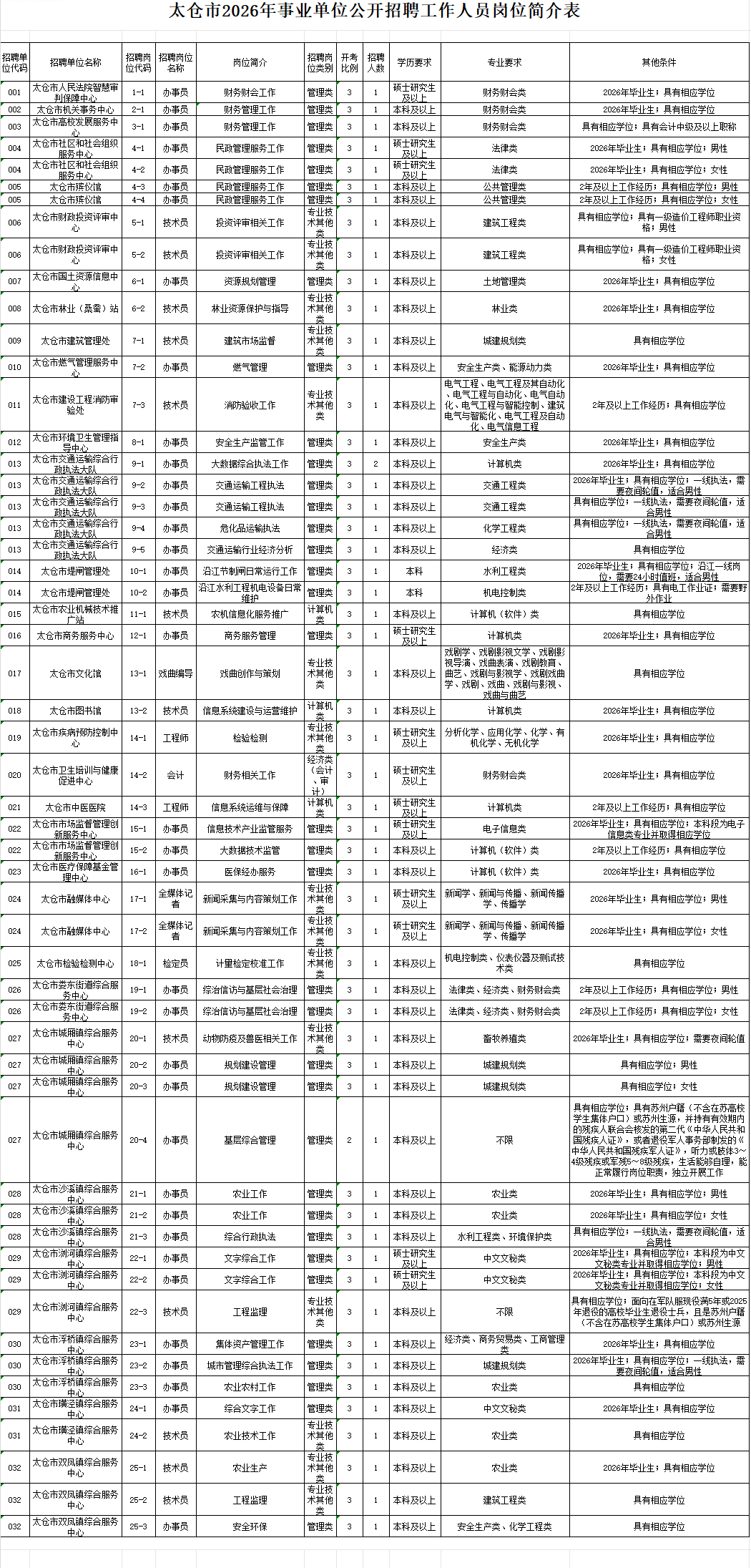 附件1:太仓市2026年事业单位公开招聘工作人员岗位简介表