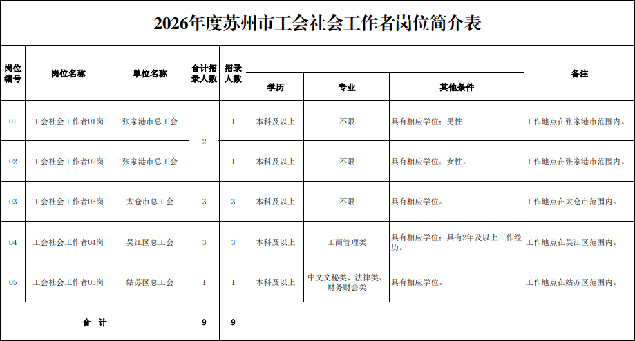 本次共计招录工会社会工作者9名,分别为:太仓市总工会3名、张家港市总工会2名、吴江区总工会3名、姑苏区总工会1名。